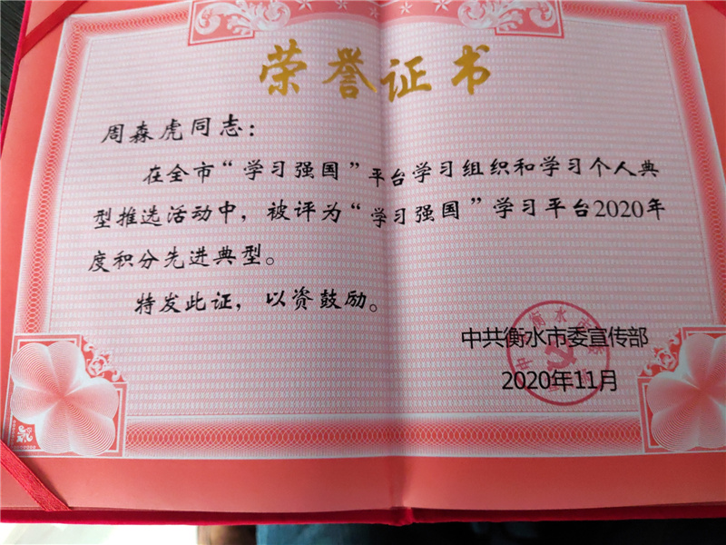 “‘學(xué)習(xí)強(qiáng)國’這個學(xué)習(xí)平臺,內(nèi)容權(quán)威、內(nèi)涵豐富、特色鮮明,我覺得受益匪淺,已經(jīng)‘上癮了’!”化學(xué)公司一車間副主任周森虎表示,從剛開始的閱讀文章、觀看視頻、答題到對平臺深入了解之后的上癮、依賴,現(xiàn)在“學(xué)習(xí)強(qiáng)國”已經(jīng)成了他每天的必修科目,到目前他個人累積學(xué)分已達(dá)到32864分,被衡水市委組織部授予“學(xué)習(xí)強(qiáng)國”學(xué)習(xí)平臺2020年度積分先進(jìn)典型。